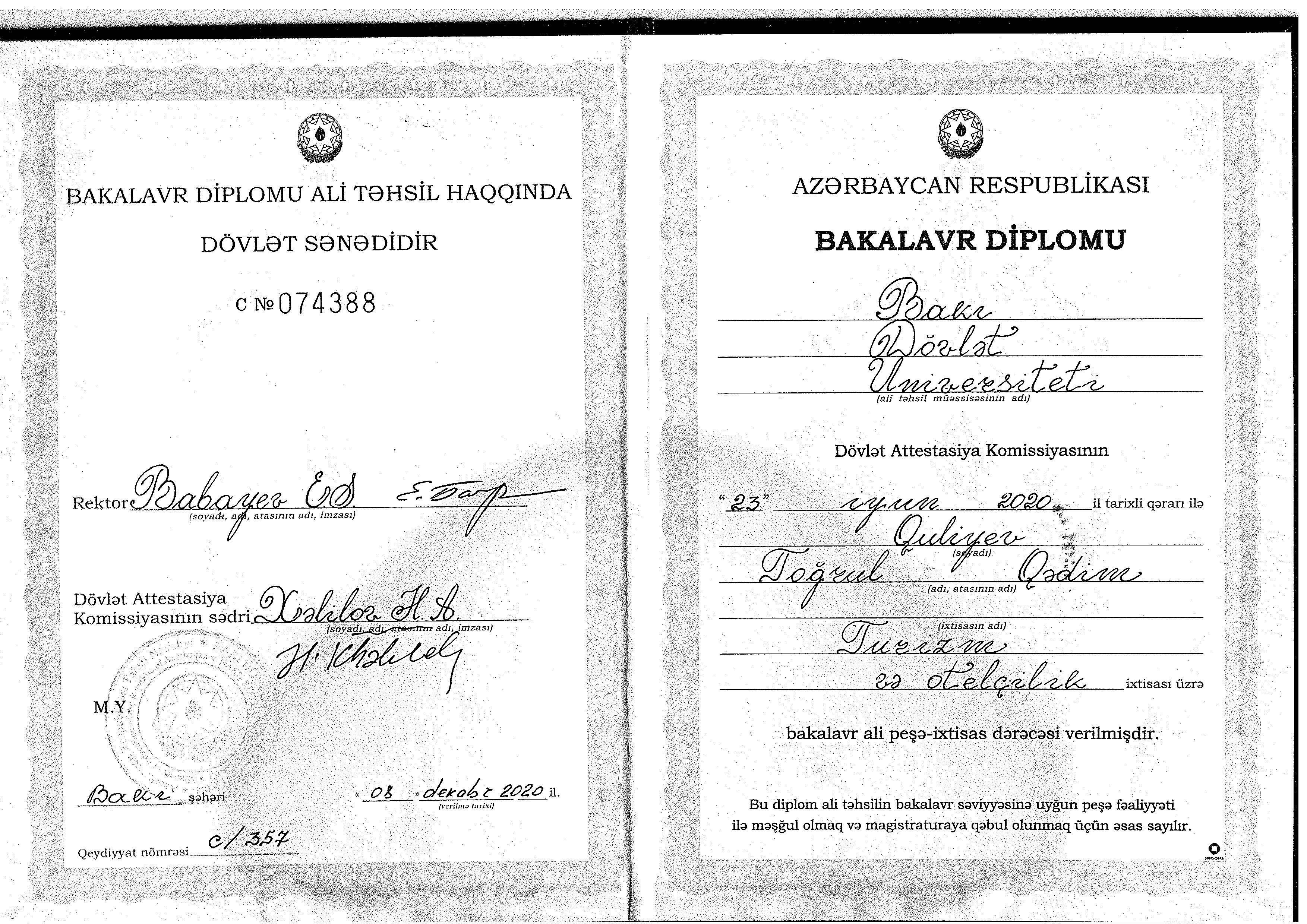 Бакинский Государственный Университет. Получил степень бакалавра в области туризма.